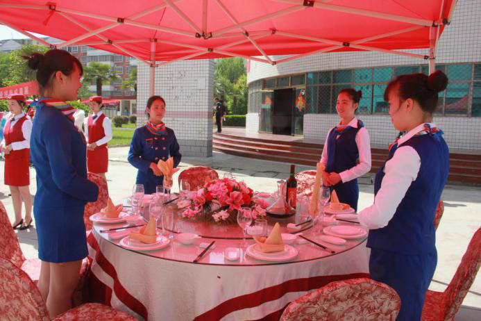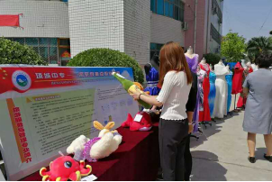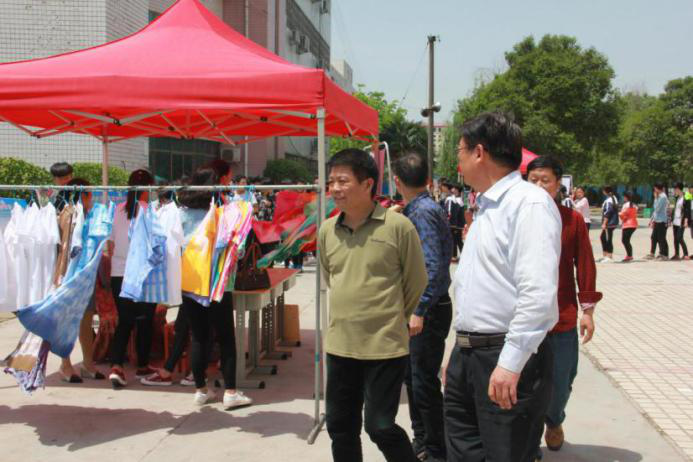 5月10日上午,学校举行职业教育活动周暨技能大赛作品展演启动仪式,项城市领导以及教体局局长张国旗参加,并分别作重要讲话。服装旅游专业负责人王赟带领专业部教师从早晨六点开始布置展示区,将扎染的围巾、再造的T恤、手工制作、服装、餐饮摆台展示、专业介绍展板一一陈列出来,迎接各界来宾的参观、指导。王赟主任、于坤平、龙启冲、李晓霞、牛瑞等老师,为前来参观的老师、学生做详细的讲解,对优秀毕业生、比赛、活动等进行宣传。