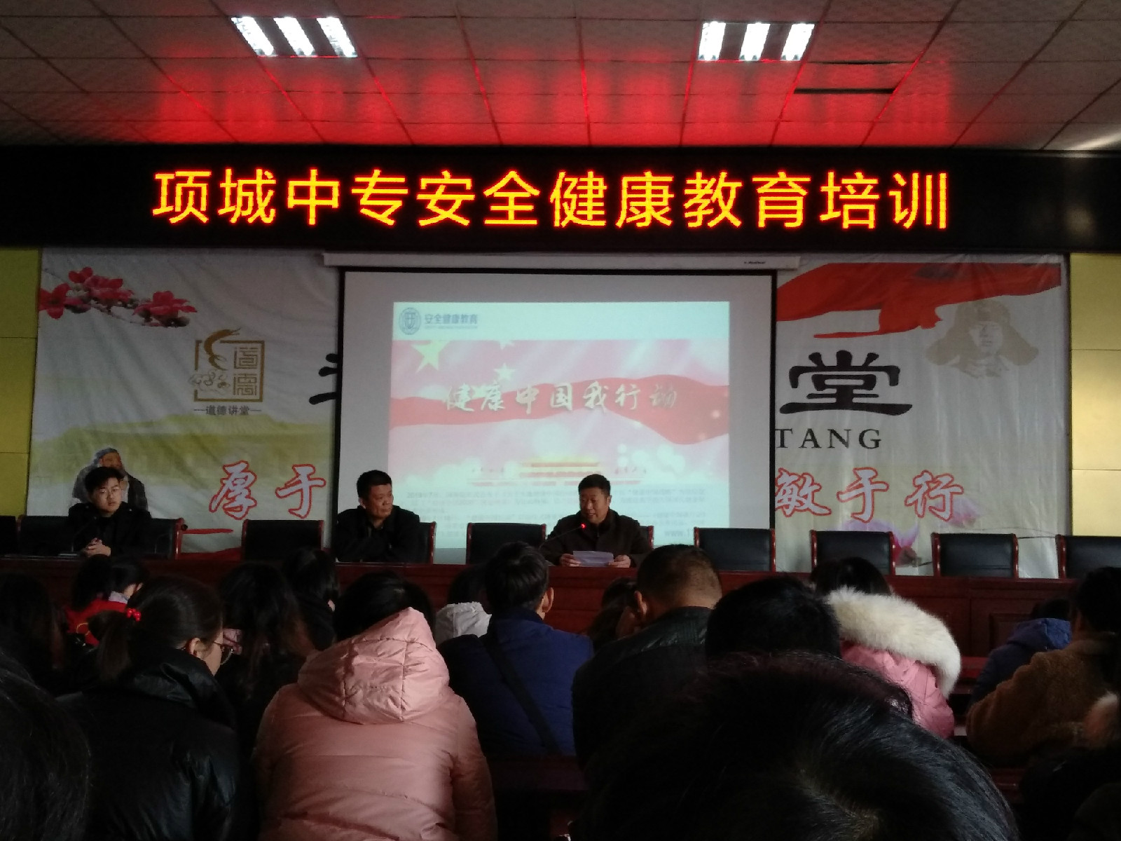 项城中专安全健康教育培训2019年11月28日上午,我校举办了安全健康教育培训讲座。本次讲座上,省爱卫会教授张喆为全校教职工进行了安全健···