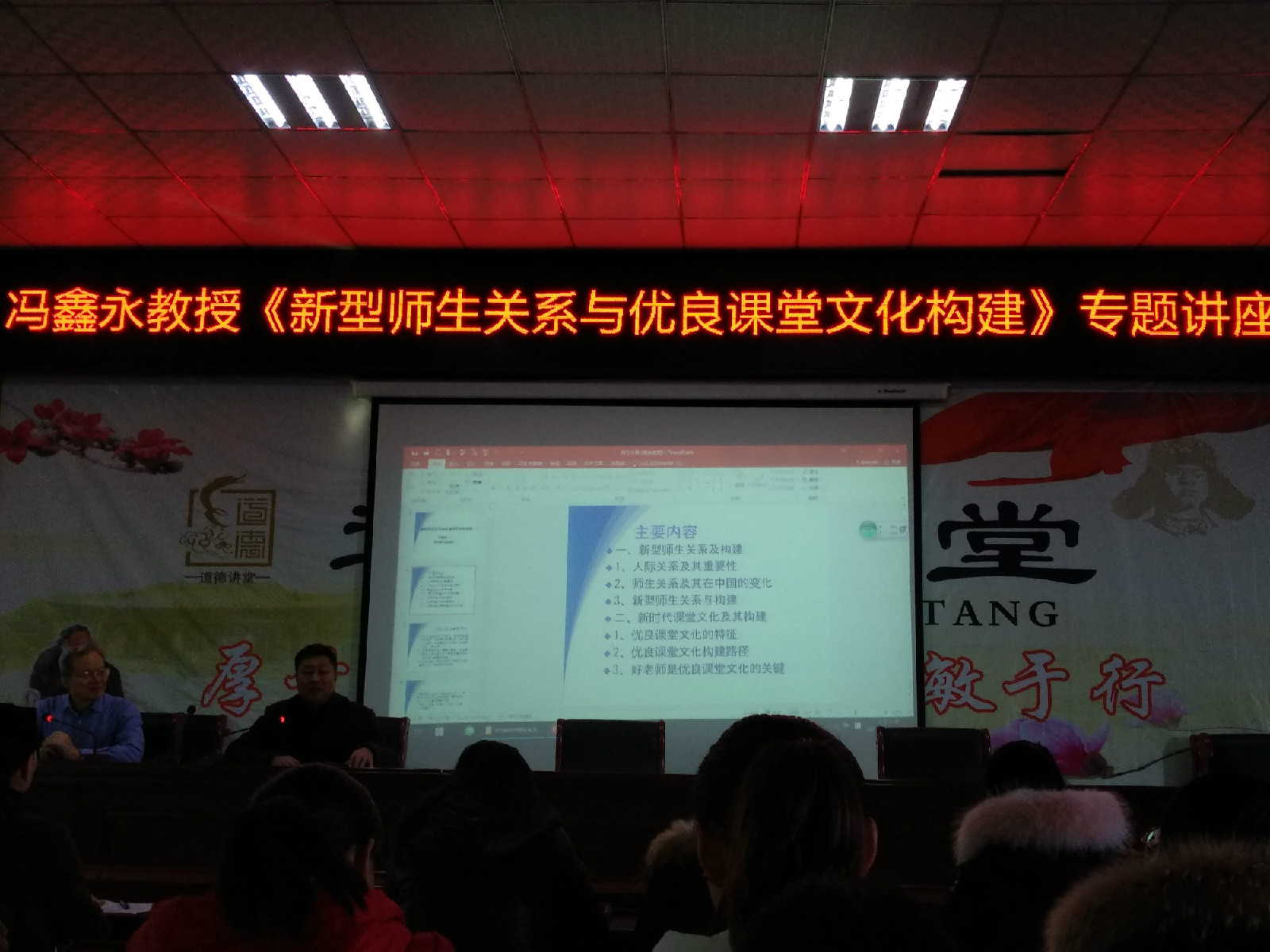《新型师生关系与优良课堂文化构建》专题讲座2019年11月28日下午,我校举办《新型师生关系与优良课堂文化构建》专题讲座,200多名师生聆···