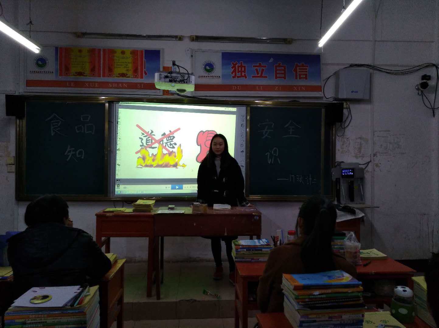 课堂上,老师首先让学生观看有关“食品安全知识”的视频。其次,班主任用实例来向学生们讲解食品添加剂知识,并结合PPT展示,图文并茂的教导学生们如何辨识三无产品和过期食品、如何辨认食品安全标识、如何使用12331举报电话等知识。在互动环节中,学生们分别讲解自己的心得体会,讲解了食用垃圾食品的危害、如何辨别垃圾食品、怎样做到科学饮食等方面知识。