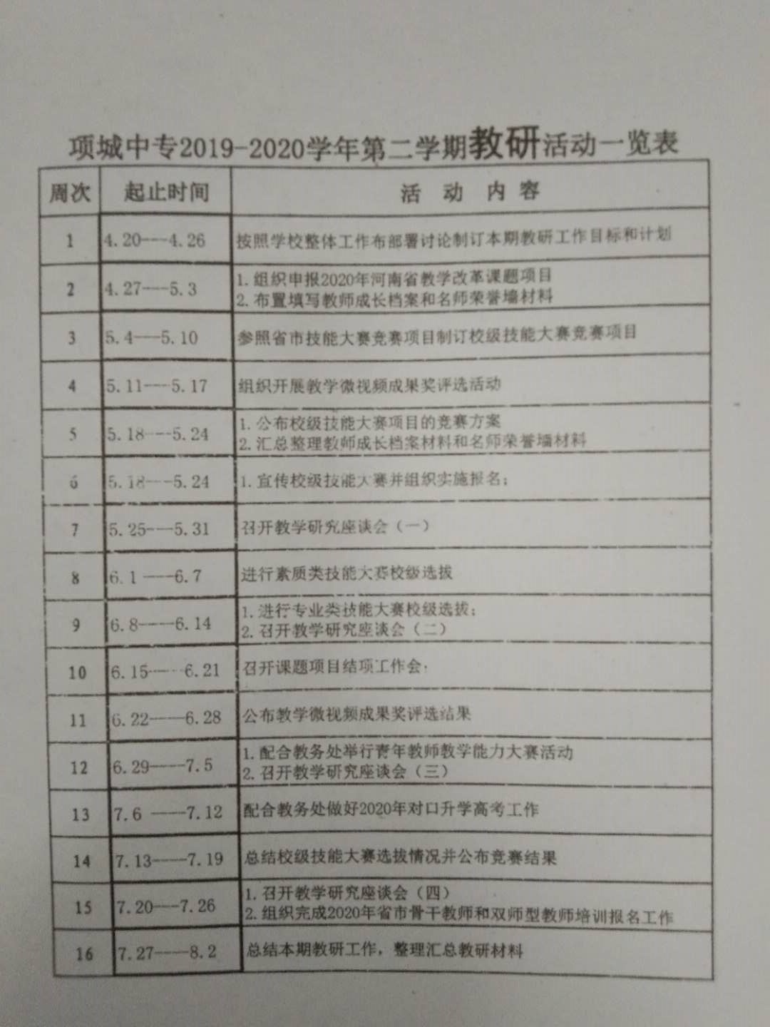 为了深入、有序、有效开展开学后教育教学工作,结合我校实际,教研室制定了2019-2020学年第二学期教研活动一览表。