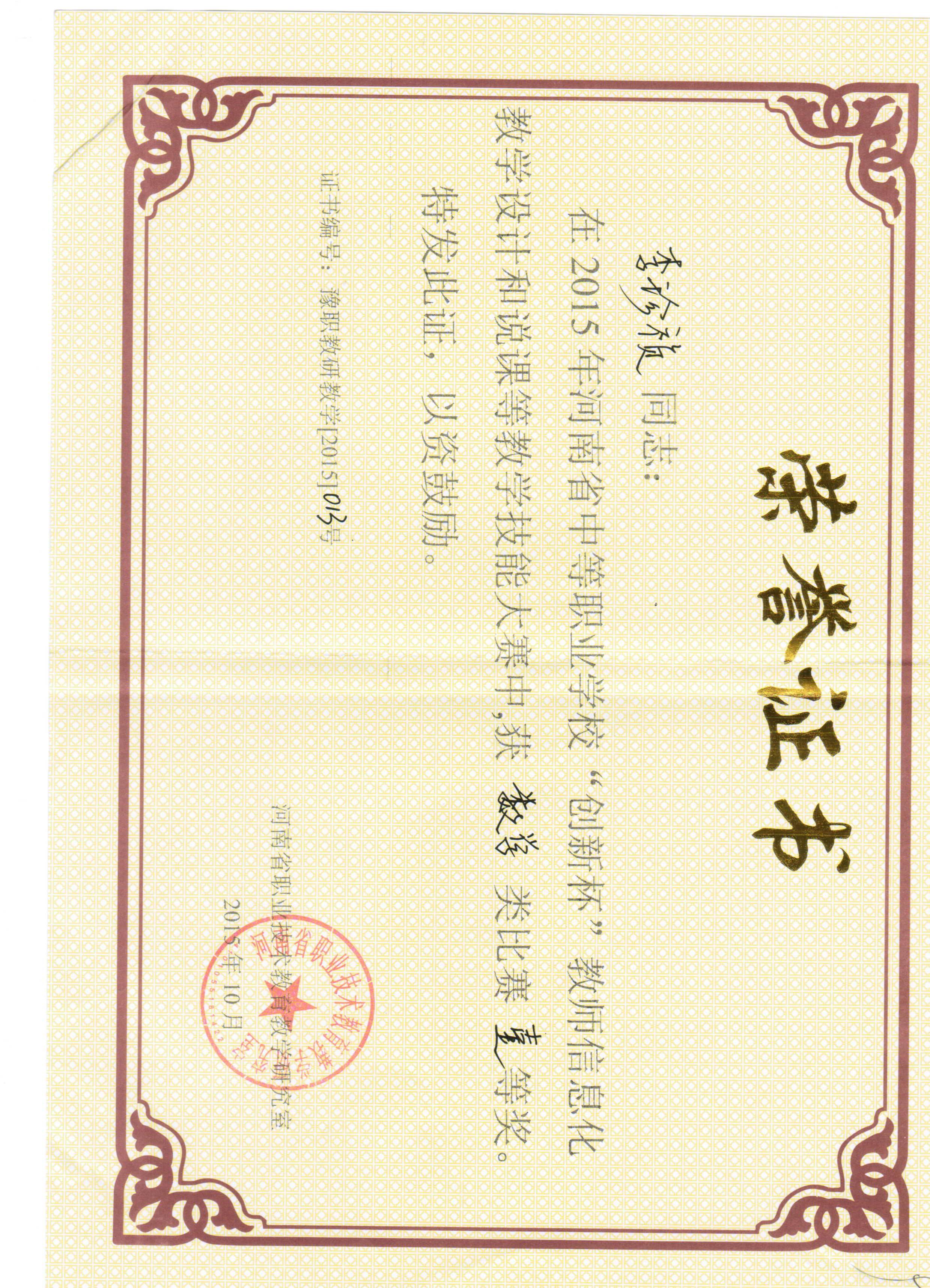 2015年10月17号,数学组教师张世娇、李珍祯、孟银霞代表我校在郑州参加河南省中等专业学校“创新杯”教师信息化教学设计和说···