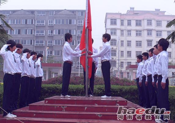 “ 学校国旗队在成人礼宣誓仪式上升国旗 学生宣誓代表进行宣誓 项城中等专业学校校长高必星发表讲话 “我宣誓···