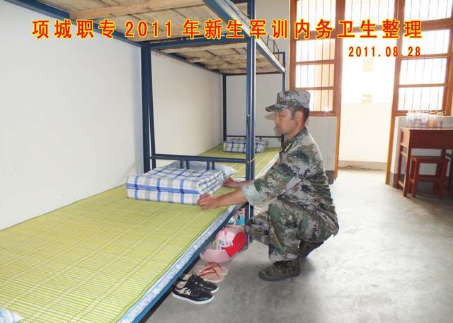 军训教官给学生示范理事内务 学生正在整理各自的床铺 整洁的学生宿舍 在这个金秋八月,丹桂飘香的季节里,项城中专···