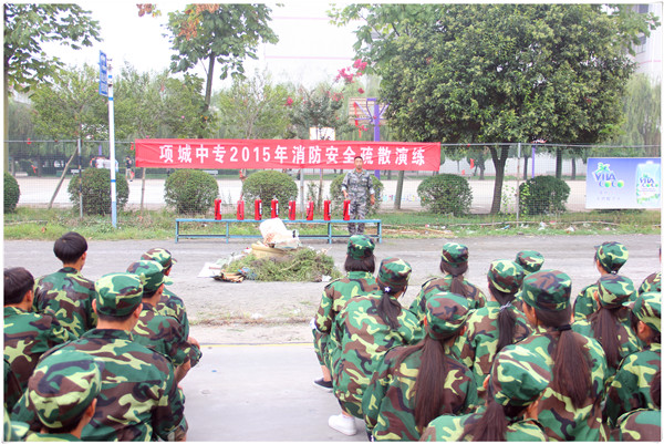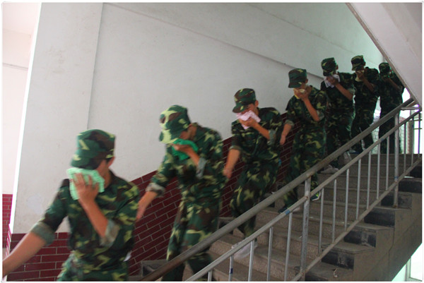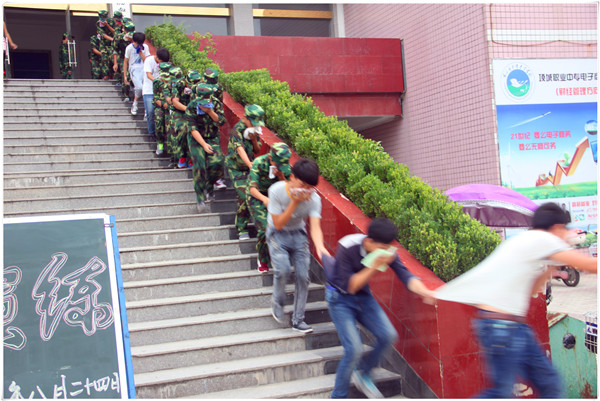 为了进一步加强学校安全工作,提高学生的应变能力和自护自救能力,应对各种突发事件。经过校团委、政教处充分的准备,细致分工,我校于8月24日下午组织军训新生开展了火灾、消防疏散演练活动。
