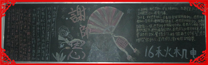 金秋九月,在这个感恩的季节里,我们迎来了神圣的教师节。习总书记在北京师范大学师生代表座谈时讲到:“教师是人类历史上最古老的职业之一,也是最伟大、最神圣的职业之一,自古以来,中华民族就有尊师重教的优良传统……”为了感恩教师的辛勤付出和无私奉献暨在第33个教师节来临之际,我校各班同学用传统的黑板报的形式表达了对敬爱的老师的赞美之情。