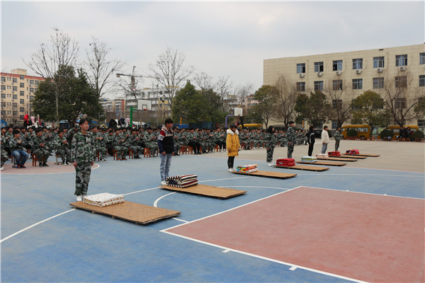 在军事训练科目表演中,各方队整齐划一,口号嘹亮,依次通过大会主席台。尽管天公不作美,但这丝毫不能影响各方队如火的热情。军事技能训练展示时,同学们认真表演,听从指挥。站军姿,气宇轩昂;踢正步,意气风发;唱军歌,斗志昂扬。呐喊声此起彼伏,响彻了整个校园;内务整理展示时,同学们一丝不苟的整理着被褥,不一会一条条被褥就变成了整齐的“豆腐块”。