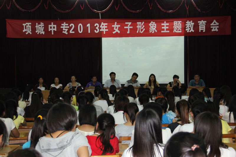 2013年8月29日晚上,项城中专在实训楼五楼召开了女生形象主题教育会,参加会议的领导有校团委书记汪长亮同志、服装专业部主任王赟同志···
