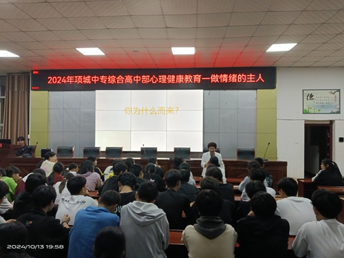 做情绪的主人——项城中专综合高中部心理健康教育讲座为进一步加强学生心理健康教育,培养学生积极乐观的心态,帮助学生学会正确调整情绪,成为管理情绪的主人,近日,项城···