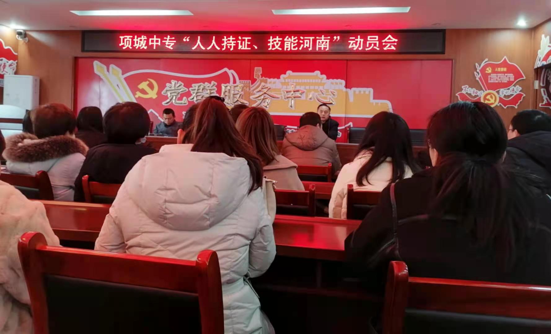 2月28日下午,我校召开了“人人持证,技能河南”动员会,会上张锦军校长宣读了文件精神,讲述普通话等级证书的考核标准、考核方法。